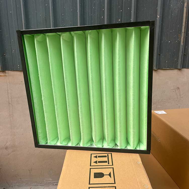 過濾材料是以折疊形式裝入高強度模切硬紙板內(nèi),迎風(fēng)面積增大。流入的空氣中的塵埃粒子被過濾材料有效阻擋在褶與褶之間。潔凈空氣從另一面均勻流出,因此氣流通過過濾器是平緩和均勻的。視過濾材料不同,它所阻擋的粒徑從0.5μm到5μm而不同,過濾效率也不同 。